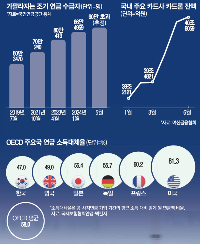 국민연금과 기초연금 같은 공적연금외에 노후소득을 책임질 사적연금 활용이 제대로 정착되지 않다보니 한국의 노후소득 대비는 선진국과 비교해 취약한 수준이다. 작년 국제보험협회연맹과 맥킨지가 발표한 자료에 따르면,공·사적연금을 통합한 소득대체율을 비교해보면 한국은 47%에 그쳐 경제협력개발기구(OECD) 최하 수준이었다. OECD 평균(58%)보다 10%포인트 낮고,미국(81.3%),프랑스(60.2%),독일(55.7%),일본(55.4%)과도 차이가 컸다. 한국과 비슷한 조기연금 제도를 운영한 일본의 조기수급자 비율은 2021년 기준 11.2%인데 반해 한국은 15.9%인 것도 이런 배경이 작용하고 있다.