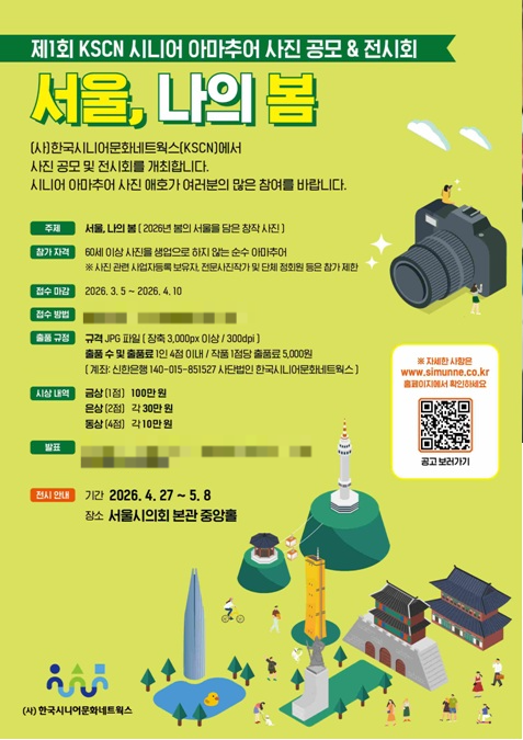 (사)한국시니어문화네트웍스(KSCN)는 ‘제1회 KSCN 시니어 아마추어 사진 공모&전시회’를 개최한다고 4일 밝혔다.