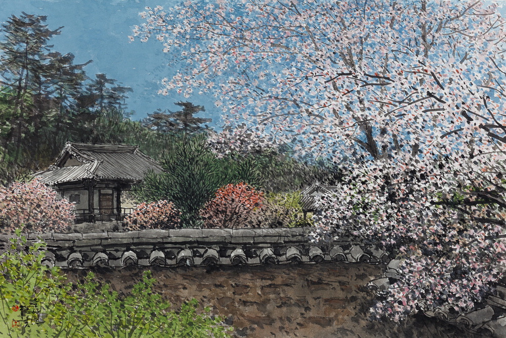 용원정에 등장한 벚꽃 풍경은 사실 지난해 11월 가을에 본 장면을 바탕으로 완성됐다. 누군가 보여준 사진 속 벚꽃은 아름다웠지만 정자가 너무 가려 아쉬웠다고 한다. 그래서 아내와 함께 직접 다녀왔다. "그 가을 경치를 찍은 뒤 제 마음속에 있는 벚꽃을 입혀 봄 풍경으로 다시 그린 거예요."