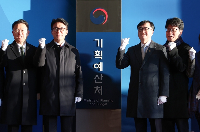 김민석 국무총리와 임기근 차관을 비롯한 기획예산처 공무원들이 2일 정부세종청사 5동에서 기획예산처 현판을 제막한 뒤 기념 촬영하고 있다. 2026.1.2 (연합뉴스) 기획예산처는 대내외 정책환경 변화에 능동적으로 대응하고,조직의 혁신과 활력을 높이기 위해 2026년 과장급 정기인사를 단행했다고 6일 밝혔다.