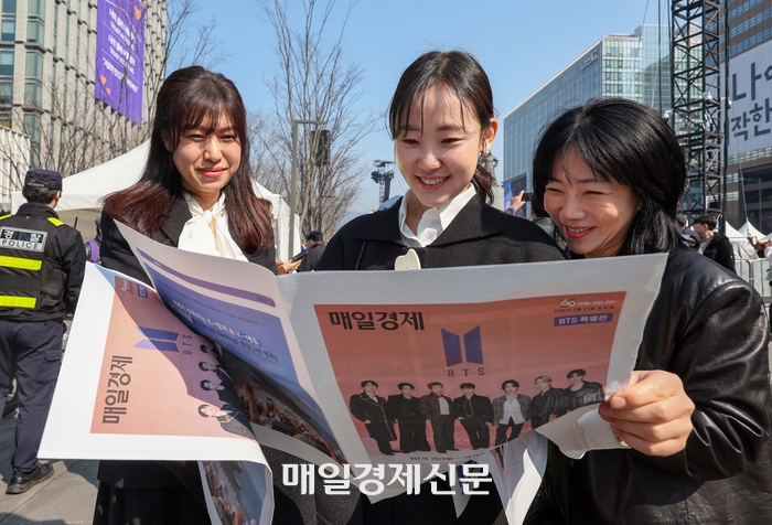 매일경제는 이날 BTS 컴백을 기념해 타블로이드 특별판을 제작해 광화문·시청역 등 4곳에서 무료로 배포했다. 현장에는 특별판을 받으려는 팬들의 행렬이 이어졌다. 인도에서 온 아슈비타(22)는 “멤버들 모습이 크게 담겨 마음에 든다. 색깔도 예쁘다”며 “기념품으로 챙겨 인도에 가져갈 것”이라고 말했다. 손등에 ‘ARMY’ 문신을 새긴 일본인 요시카와 아이(48)는 “무료 배포라 놀랐다. 디자인이 마음에 들어 꼭 챙겨야겠다고 생각했다”고 말했다. 일부 팬들은 “평생 간직하겠다”며 특별판을 소중히 품에 안았다.