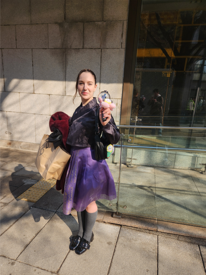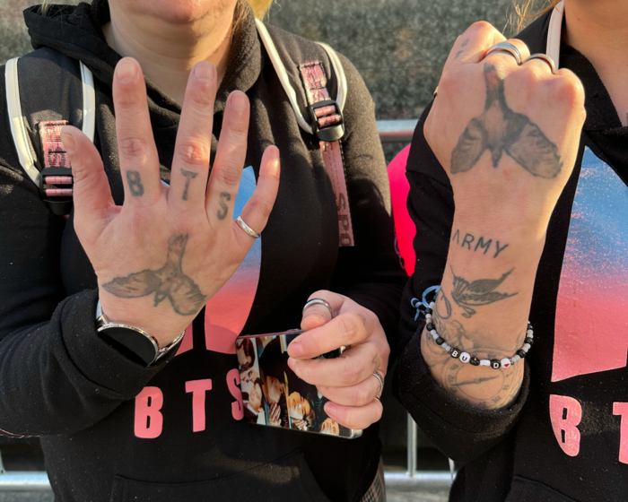 쌍둥이 자매가 손등과 팔목에 새긴 ‘BTS’·‘ARMY’ 타투를 공개하고 있다. 21일 오후 서울 광화문 동화면세점 인근. [구정근 기자] 보랏빛 한복을 곱게 차려입은 채 서로의 모습을 사진으로 남기며 공연 전 설렘을 만끽하는 아미들도 곳곳에서 눈에 띄었다. 한국에서 5년째 거주 중인 루마니아인 수로지오 이와나(25)는 보라색 치마의 개량 한복 차림으로 평택에서 새벽 버스를 타고 왔다. 그는 “한 인플루언서가 ‘공연 당일 드레스 코드로 한복을 입자’고 이야기해 한복을 구매해서 입고 왔다”며 “한복 값이 많이 올랐다. 예전엔 10만원대였는데 지금 입은 것은 25만원에 샀다”며 웃었다.