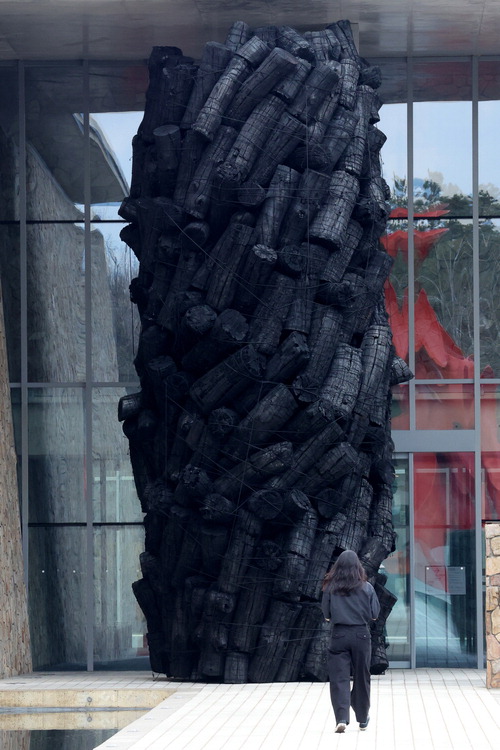 8m 높이의 거대한 숯 기둥이 관람객의 동선을 가로막는다. 뮤지엄산 입구에 세워진 이 설치 작품은 2022년 강릉 산불 이후 작가가 마주한 공포,그리고 재해를 극복하려는 염원을 형상화한 결과다. '숯의 작가' 이배(70)가 30년 넘게 천착해온 숯은 자연의 순환을 넘어 재앙과 치유에 대한 질문으로 확장된다.