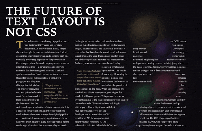 최근 개발자 플랫폼 깃허브에서 화제가 된 ‘프리텍스트(Pretext)’도 바로 이런 지점을 파고든 기술입니다. 쉽게 말해 사용자가 마우스로 특정 지점을 누르거나 이미지를 글 사이로 끌어오면 주변 텍스트가 순간적으로 흔들렸다가 다시 자리를 잡는 식의 화면을 구현하게 해주는 기술이죠. 얼핏 보면 단순한 시각 효과처럼 보이지만 사실은 웹에서 가장 까다로운 작업 가운데 하나입니다.
