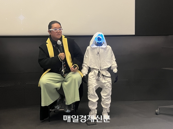 최용호 갤럭시코퍼레이션 대표가 AI 안경을 착용하고 AI 로봇을 소개하고 있다. 앉아 있다. 박성배 기자