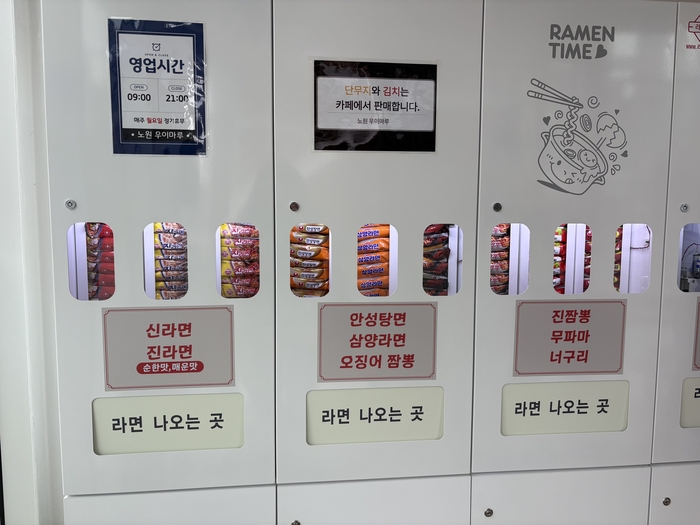 라면조리실 무인자판기/사진=김지은 여행+ 기자 카페 옆 별도 공간으로 조성된 라면조리실도 인기다. 무인 자판기와 셀프 조리기를 활용해 이용할 수 있으며,기존 두물마루와 당현마루에서 반응이 좋았던 운영 방식을 반영했다. 진라면,무파마,짜파게티 등 판매 순위가 높은 인기 라면 10종을 갖췄고 김치와 단무지도 함께 판매한다.