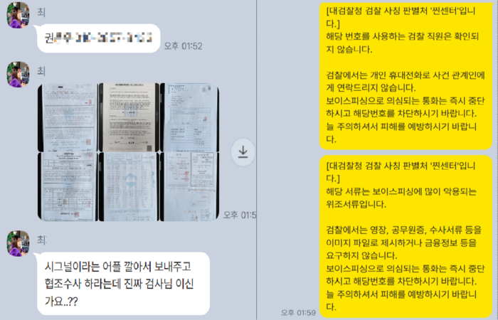카카오는 지능화되는 보이스피싱 범죄를 선제적으로 차단하고 피해에 실시간 대응하고자 대검찰청과 협업을 이어왔다. 검찰 서류의 진위 여부나 수사관 사칭 여부를 신속하게 안내받을 수 있는 카카오톡 채널 ‘대검찰청 찐센터’를 카카오 고객센터 내 ‘고객센터 사칭 주의 안내’ 영역에 연동해 의심 사례를 빠르게 확인 후 신고까지 바로 이어질 수 있도록 지원하고 있다.