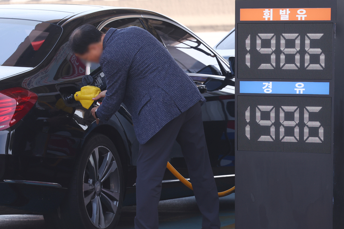 서울의 한 주유소에서 시민이 주유를 하고 있다. [연합뉴스] 이문희 한은 물가통계팀장은 “4월 1일부터 13일까지 두바이유 평균 가격이 전월 평균보다 14.8% 하락했지만,환율은 같은 기간 1.0% 상승했다”며 “미국·이란 협상 결과가 불확실하고 당분간 원자재 공급 차질이 완전히 해소되기 어려운 점 등을 고려하면 4월 수입 물가 향방은 아직 예상하기 어렵다”고 말했다.