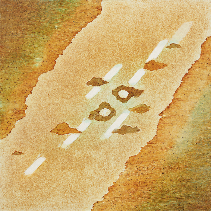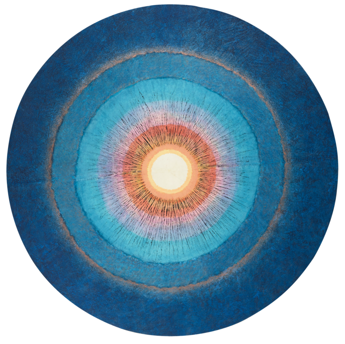 방혜자의 ‘하늘의 땅’(2011) <국립현대미술관 이건희컬렉션> 빛을 표현한 원형 작업이 특히 눈길을 끈다. 작가는 닥종이를 고깔 모양으로 구겨 주름을 만들고 이를 펼쳐 먹으로 원형을 그렸다. 이후 종이의 결을 따라 붓질했다. 튀어나온 부분에 색이 입혀지고 패인 부분에는 여백이 남는다. 여기에 아크릴,천연안료,유화 등을 여러 겹 쌓아 올렸다. 뒷면에 색을 입혀 앞면에 은은하게 스미게 하는 동양화의 배체법을 더해 독특한 마티에르를 완성했다. 빛이 반짝이듯 아름다운 색채가 깊이 있는 화면에서 피어오른다.