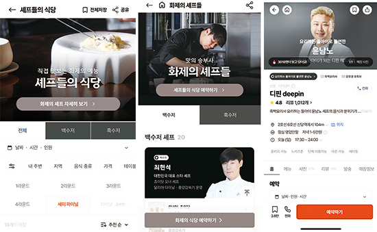 레스토랑 예약 애플리케이션 ‘캐치테이블’도 검색 창에 흑백요리사를 넣으면 곧장 ‘셰프들의 식당’이라는 앱 내 스페셜 창이 뜬다. 여기에는 백수저와 흑수저 요리사들의 레스토랑이 일목요연하게 정리되어 있고 심지어 프로그램 회차별 생존자들의 업장으로까지 분류를 확대해뒀다.