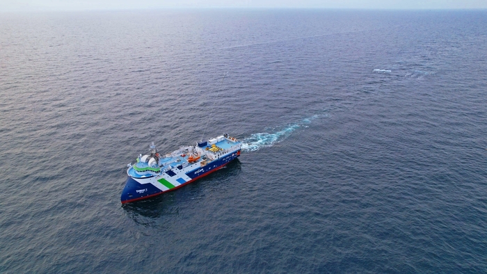 탐해3호가 동해에서 스트리머 장비를 활용해 탄성파 탐사를 수행하고 있다. [사진=지자연] 한국지질자원연구원의 최첨단 물리탐사연구선 탐해3호 14일 서태평양 공해로 첫 대양 탐사를 위해 출항한다. 해저 희토류 정밀 탐사에 본격 착수하는 것이다.