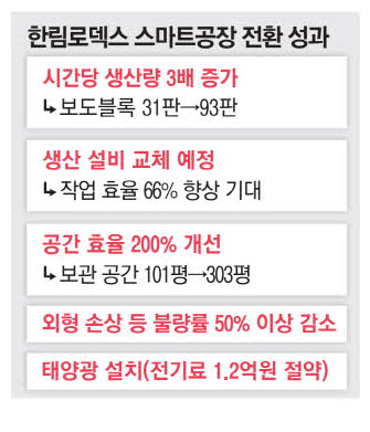 가장 눈에 띄는 변화는 몰드 교체 시간 단축이다. 몰드는 콘크리트 블록의 형태를 잡아주는 금형 장비로,생산 제품의 규격과 디자인을 좌우하는 핵심 설비다. 기존엔 교체에 60분이 걸렸지만 20분으로 줄였다. 시간당 생산할 수 있는 보도블록도 31판에서 93판으로 3배 증가했다. 실내 야적장 공간은 101평에서 303평으로 늘었고 공장 지붕에 태양광 설비를 얹어 연간 1억2000만원의 전기료를 절감하게 됐다. 골재 투입구,이송 레일,안료 계량,완제품 포장까지 공정별로 비효율적이었던 구조를 전면 개선했다.