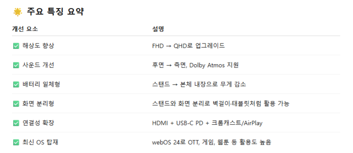 스탠바이미2 주요 특징 이에 스탠바이미 2는 27형 QHD(2560X1440) 해상도 디스플레이를 탑재해 기존 제품(FHD 디스플레이) 대비 한층 향상된 화질을 제공한다. 또 전원 연결 없이 최대 4시간까지 사용할 수 있도록 고용량 내장 배터리를 탑재했다.