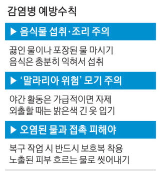 가장 중요한 건 감염원을 멀리하는 것이다. 끓인 물이나 포장된 물을 마시고,음식물도 가열해서 먹는 게 좋다. 조리한 음식을 오래 보관하지 말고,감염 가능성이 있는 사람은 조리에 참여하지 않아야 한다. 모기에 물리는 걸 최소화해야 하는 만큼 집 안에서도 모기장을 사용하고 외출을 가급적 자제하는 게 좋다. 만약 외출해야 한다면 밝은색 긴 옷을 입고,모기 기피제를 사용해야 한다.