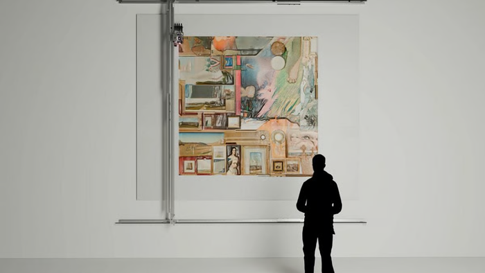 한 작품은 온라인 경매가 진행되는 약 2주 동안 현장에서 실시간으로 완성돼 더욱 눈길을 끌었다. 미국 매사추세츠공대(MIT) 미디어랩 출신으로 오픈AI의 첫 예술가 레지던시 프로그램에도 참여한 미국 작가 알렉산더 레벤의 AI 기반 실시간 로봇 페인팅 작품 ‘Untitled Robot Painting’(2025)이다. 작가의 명령어를 바탕으로 생성형 AI 기반의 붓을 쥔 로봇 손이 벽면에 설치된 채 캔버스 위에 그림을 점진적으로 확장해 그려나가는 방식을 따른다. 프린터기처럼 작동하는 이 AI 로봇은 2.5×2.5㎝에서 시작해 최대 305×366㎝까지 그릴 수 있고,이번 작품은 8190달러(약 1120만원)에 낙찰됐다. 작품명 역시 AI가 지었다.