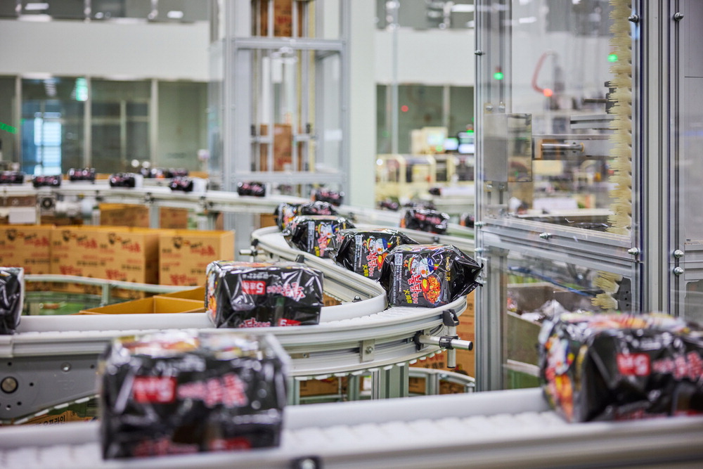 삼양식품 밀양 제1공장에서 제조돼 미국으로 수출되는 불닭볶음면 제품이 컨베이어 벨트를 따라 운반되고 있다. 삼양식품