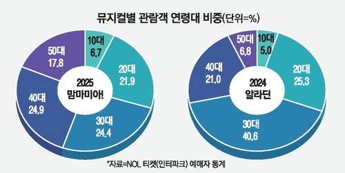 1999년 영국 웨스트엔드를 시작으로 브로드웨이를 거쳐 2004년 한국에 상륙한 이 뮤지컬은 21년째 흥행 신화를 쓰고 있다. 4050 여성 관객의 압도적 지지가 이 뮤지컬을 스테디셀러 반열에 올려놓았다. 놀(NOL) 티켓에 따르면 올해 맘마미아 최대 예매자는 40대가 24.9%를 차지하며 1위를 기록했다. 2년 전에도 40대가 1위였다. 지난해 뮤지컬 '시카고'와 '알라딘'에서는 각각 20대와 30대가 50.8%,40.6%로 1위를 기록한 것과 대조적이다. 특히 대부분의 뮤지컬에서 한 자릿수에 그치는 50대 관객 수가 올해 맘마미아에서는 무려 17.8%로 3위를 기록한 점도 눈에 띈다. 남녀노소 모두 사랑하는 뮤지컬이지만 4050 여성이 특히 환호하는 공연임을 보여주는 수치다.