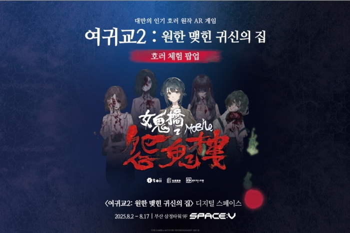 < 사진 제공 : 스페이스브이(SPACE V) > 스페이스브이는 여름 시즌을 맞아 오는 8월 2일(토)부터 17일(일)까지 부산 삼정타워 9층에서,8월 7일(목)부터 2주간 홍대 AK 2층에서 대만 넷플릭스의 인기 공포영화 ‘여귀교 2: 원한 맺힌 귀신의 집’ 호러 체험 팝업을 오픈한다. 대만 넷플릭스에서 절찬리에 방영하고 있는 인기 공포영화를 애니메이션 AR 게임으로 만든 대만 게임사 Toii games(토이게임즈)와의 합작으로 6가지 디지털 공포 체험을 기획하며,여름의 무더위를 한 번에 날릴 수 있는 오싹한 체험을 원하는 이들에게 특별한 방학 콘텐츠가 될 것으로 기대된다.
