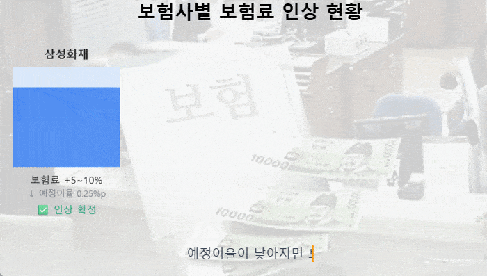 4일 보험업계에 따르면 삼성화재·DB손해보험·KB손해보험은 이달부터 보험료를 적게는 5%,많게는 10% 인상하기로 했다. 예정이율이 기존보다 0.25%포인트 낮아져서다. 메리츠화재는 예정이율 인하를 아직 확정하지는 않았지만,향후 인하 폭과 일정 등을 검토하고 있다.
