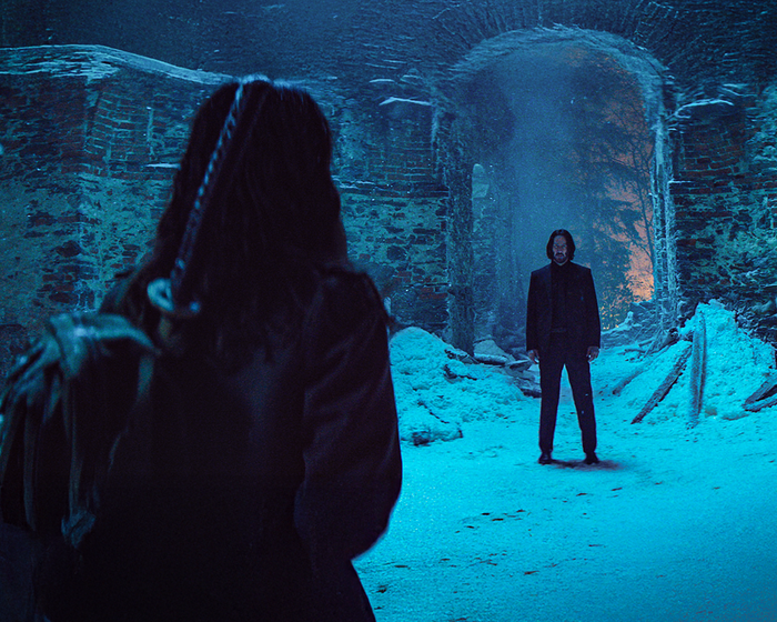 영화 ‘발레리나’의 한 장면. 루스카 로마 디렉터가 급파한 존 윅(키아누 리브스·오른쪽)이 주인공 이브 마카로(아나 데 아르마스)를 막아선 모습. 판씨네마