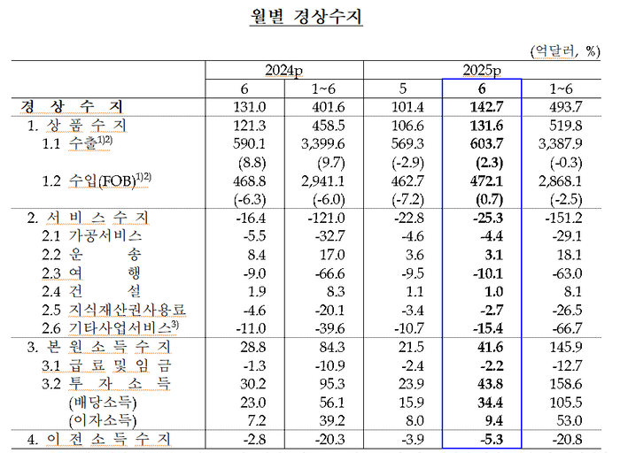 한국은행이 7일 발표한 ‘6월 국제수지(잠정) 통계’에 따르면 6월 경상수지는 142억7000만달러 흑자로 집계됐다.