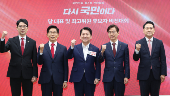 3일 서울 여의도 국민의힘 당사에서 열린 제6차 전당대회 후보자 비전대회에서 주진우(왼쪽부터)·김문수·안철수·조경태·장동혁 당 대표 후보들이 기념촬영 하고 있다. (사진=연합뉴스) [속보] 김문수·안철수·장동혁·조경태 국힘 본경선 진출…주진우 탈락