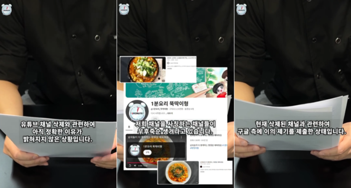 [사진 = 뚝딱이형 인스타그램 갈무리] 지난 3월에는 300만 구독자를 보유한 ‘1분요리 뚝딱이형’ 채널이 갑작스럽게 삭제됐다. 당시 뚝딱이형은 정확한 이유를 모르겠다고 호소했다. 그러면서 사기를 목적으로 한 사칭 채널이 생성되고 있다며 주의를 당부하기도 했다.