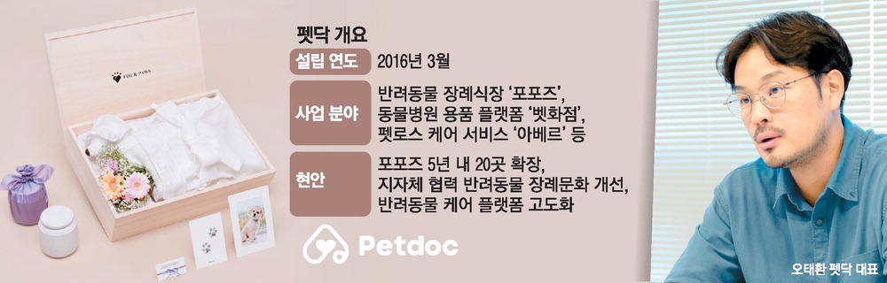 오태환 펫닥 대표는 20일 매일경제와 인터뷰하면서 "펫 산업이 산업성장 속도에 비해 시장이 낙후돼 있고,압도적인 1등 기업이 없어서 도전해 볼 만 하다고 생각했다"며 "가족 일원인 반려동물의 '장례'에 대해서도 예를 갖춰야 한다고 생각했다"고 창업 배경을 설명했다. 특히 그는 "동물 역시 행복하게 살다가 삶을 마무리할 권리가 있다는 인식 전환이 펫산업의 중심이 돼야 한다"고 강조했다.