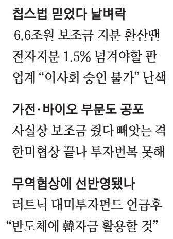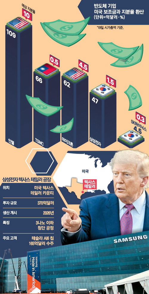 도널드 트럼프 미국 행정부가 전임 조 바이든 행정부 시기에 반도체지원법(CHIPS Act)에 따라 지급하기로 한 보조금을 지분으로 돌려받겠다고 돌변하면서 국내 반도체 기업들은 충격에 휩싸였다.