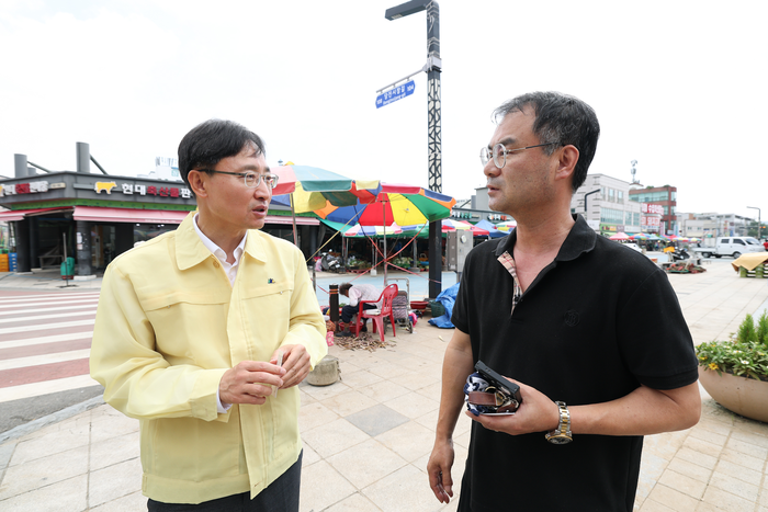 임광현 국세청장(왼쪽)이 24일 집중호우 피해지역인 충남 당진어시장을 방문해 상인회장과 대화하고 있다. [사진제공=국세청] 국세청이 자영업자 개·폐업 현황 등 내수 경제와 밀접한 경제 지표들을 관련 부처와 지방자치단체에 앞으로 매월 제공한다고 20일 밝혔다.