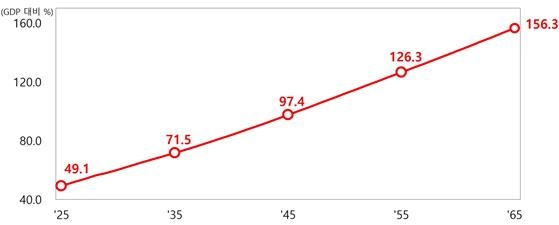 나랏빚 ‘조기 경보음’…국가채무비율 40년간 156%로 3배로 폭등 [사진 출처 = 연합뉴스] 국내총생산(GDP) 대비 50% 수준인 국가채무비율이 40년 이후에는 150%대로 3배로 급등할 것이라는 관측이 나왔다. 인구가 감소하고,성장세가 둔화하는 현재의 흐름을 반영한 전망치다.