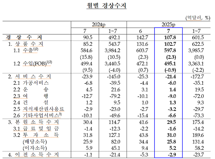 한국은행이 4일 발표한 ‘7월 국제수지(잠정) 통계’에 따르면 7월 경상수지는 107억8000만 달러 흑자로 집계됐다.