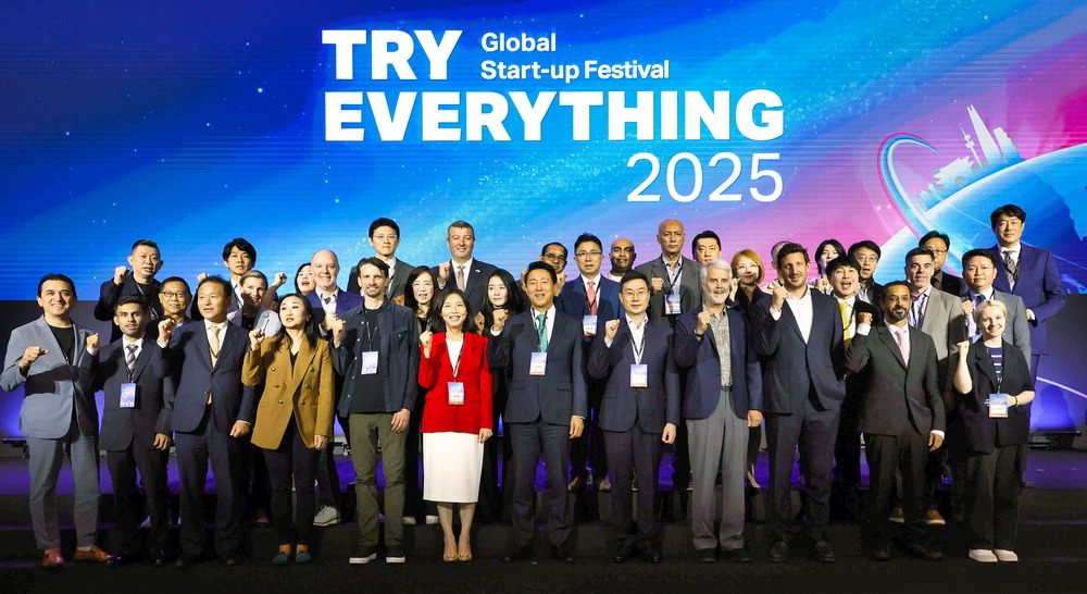 서울 중구 동대문디자인플라자(DDP)에서 11일 열린 '트라이 에브리싱 2025' 개막식에서 주요 내빈들이 기념촬영을 하고 있다. 매년 세계지식포럼과 함께 열리는 트라이 에브리싱은 서울시,서울경제진흥원(SBA)과 매일경제가 공동 주최하는 글로벌 스타트업 축제다. 앞줄 왼쪽 다섯째부터 제이슨 베이미그 아이언클래드 대표,최호정 서울시의회 의장,오세훈 서울시장,장승준 매경미디어그룹 부회장,마틴 에버하드 테슬라 공동창업자,잭 캐스 전 오픈AI 상업화전략 총괄. 김호영 기자