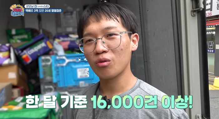 정상빈씨가 한 달 1만 6천개의 택배를 배송한다고 밝혔다. 사진| KBS2 정씨는 매일 약 30km를 뛰어다닌다. 그는 “택배는 건당 무게나 크기 상관없이 700원을 받는다. 한 달 수입은 1100만~1200만 원 정도”라고 말했다. 이는 1만 7000건 이상을 배송해야 가능한 금액이다.
