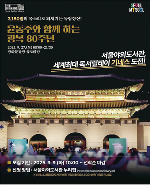 서울도서관 광복 80주년 기념 세계 최대 독서 릴레이 기네스북 도전(사진 서울시) ☞ 광복 80주년,윤동주 시인 서거 80주기에 맞춘 ‘독서 릴레이’서울시는 광복 80주년과 윤동주 시인 서거 80주기를 맞아 9월 27일(토) 광화문광장에서 시민들과 함께 ‘세계 최대 독서 릴레이(Largest Reading Relay)’ 기네스북 도전에 나선다. 독서 릴레이는 윤동주 시인의 유고 시집 『하늘과 바람과 별과 시』 전문을 시민들이 한 문장씩 이어 낭독하는 방식으로,문학으로 저항에 나섰던 시인 윤동주를 통해 광복 80주년이라는 역사적 의미를 되새긴다.현재 기네스북에 등재된 ‘독서 릴레이’ 세계 기록은 인도에서 『간디 자서전』을 낭독한 3,071명이다. 서울도서관은 광복 80주년,윤동주 서거 80주기의 의미를 담아 3,180명을 목표 인원으로 설정해 역사적 의미를 더했다. 또한 이번 도전은,문화 확산 모델을 선보인 서울야외도서관의 하반기 재개장과 함께 진행돼 시민들과 함께 특별한 독서 경험을 나눌 예정이다. ‘기네스북 독서 릴레이’ 모집 및 참여와 관련한 자세한 내용은 서울야외도서관 누리집과 공식 SNS를 통해 확인할 수 있다.[글 시티라이프부 이승연 기자 lee.seungyeon@mk.co.kr][사진 게티이미지뱅크,서울시,한국문화예술위원회,서울야외도서관,매경DB][본 기사는 매일경제 Citylife 제998호(25.09.23) 기사입니다]04-08