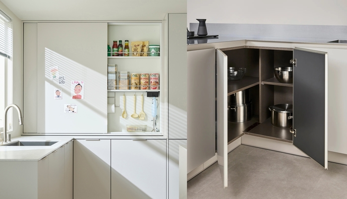 이런 요구가 반영된 대표적인 부분이 ‘히든 슬라이딩 벽장’이다. 자잘한 부엌용품과 식기,양념류 등을 한번에 숨겨 수납하면 상판을 깔끔하게 유지할 수 있다. ‘양문형 코너장’은 활용도가 낮았던 모서리 공간에 문을 달아 수납공간으로 전환하고,불필요한 마감재를 제거해 디자인 완성도를 높였다.