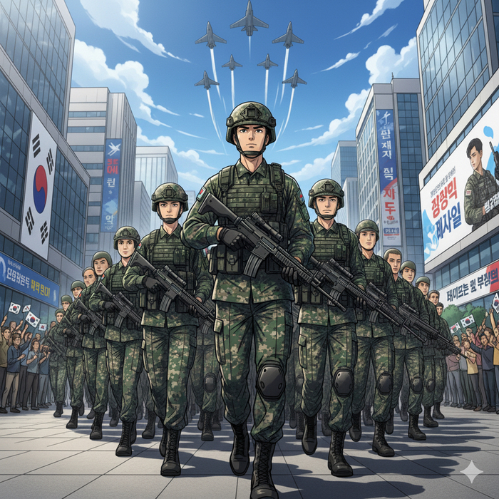 제미나이로 늠름한 대한민국 국군의 행진모습을 그려봤다. 태극기에 오류가 있다. “기상! 기상! 빨리빨리 안 일어나나!”