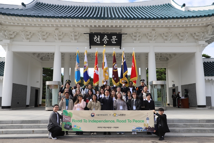‘Road to Independence,Road to Peace’ 행사에 참여한 사람들이 현충원 앞에서 기념 사진을 찍고 있다. [노랑풍선] 노랑풍선이 서울지방보훈청과 광복 80년과 국제연합(UN) 창립 80주년을 기념해 ‘Road to Independence,Road to Peace’ 행사를 진행했다.