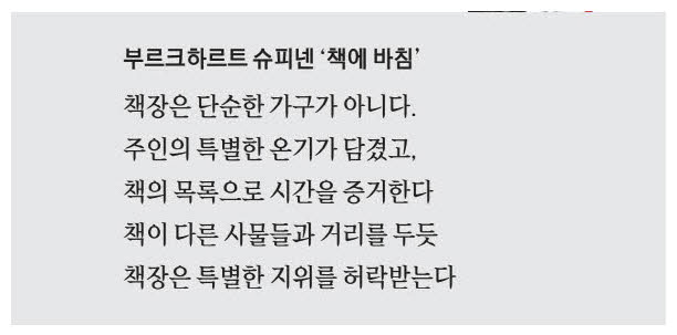 "책장은 미적이거나 윤리적이거나 도덕적으로 큰 의심을 불러일으키지 않는 유일한 가구일 것이다. 책장은 특별한 온기를 발산한다. 책장은 살아 있는 사람을 이루는 사적인 것과 공적인 것,성격과 기능과 병존을 대표한다. 그런 가구가 또 있을까."