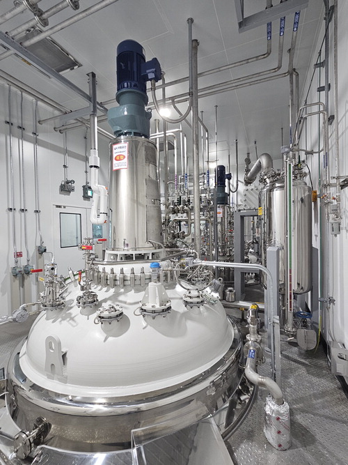 생산동으로 들어가려면 하얀색 가운을 입고,위생모와 고글,덧신도 착용해야 했다. 꼼꼼하게 손을 씻고 에어샤워를 마친 뒤에야 입장할 수 있었다. 엘리베이터를 타고 맨 위층으로 올라갔다. 여러 배관들이 연결된 은빛의 화학 반응기(사진)가 보였다. 이 반응기는 원료물질을 가지고 API를 합성하는 역할을 한다. 층을 가로지르는 복도를 기준으로 양옆으로 이런 반응기 여러 대가 구축돼 있었다.