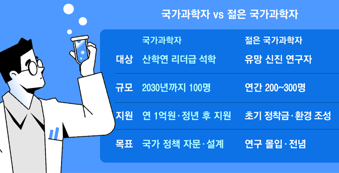 이후 이날 현장에서 “이미 성공한 사람뿐만 아니라 젊은 과학자들도 예산을 받으며 연구에 전념할 수 있게 하라”는 대통령의 지시가 더해지며 제도가 대폭 확대됐다. 이에 따라 박사학위 취득 7년 이내의 초기 연구자 중 인공지능(AI) 등 국가 주력산업 경쟁력과 직결되거나 노벨상 등 메이저급 과학상 수상 잠재력이 높은 인재를 선발하는 ‘젊은 국가과학자’ 트랙이 새롭게 신설됐다.