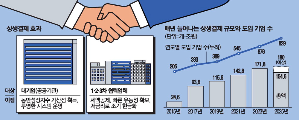 중소벤처기업부의 상생결제 사업을 운영하는 대·중소기업·농어업협력재단에 따르면 2015년 도입 첫해 206곳에 그쳤던 상생결제 도입 기업은 올해 10월 누적 829곳으로 늘었다. 결제액도 2015년 24조6000억원에서 지난해 180조3000억원으로 7.3배 불어났다. 재단 관계자는 "동반성장 평가에서 가점을 받으려고 자발적으로 가입하는 회사,협력사에서 요청해 상생결제를 도입하는 신규 회사가 증가하고 있다"고 설명했다.