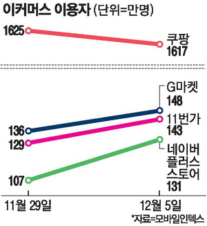같은 기간 다른 국내 주요 이커머스들은 이용자가 증가했다. 지마켓은 지난달 29일 136만명에서 이달 5일 143만명으로 5.81% 증가했고 11번가는 129만명에서 148만명으로 14.33% 늘었다. 특히 네이버가 큰 폭의 증가세를 보였다. 네이버플러스 스토어는 이 기간 107만명에서 131만명으로 트래픽이 23.1% 급증했다. 실제 거래량도 늘었다. 12월 1~4일 기준 네이버플러스 스토어 거래량과 배송량은 전주(11월 24~27일) 대비 각각 20.4%,30.7% 늘어났다. 네이버 관계자는 "계절 요인과 프로모션 영향으로 관련 거래량이 증가한 것"이라고 설명했다.
