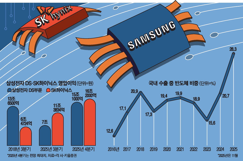 AI 가속기 개발 경쟁과 HBM 수요 증가로 SK하이닉스가 4분기 약 16조2000억원의 영업이익을 기록하며 삼성전자 DS 부문의 예상치인 약 15조1000억원을 넘어설 전망입니다. 두 기업 모두 반도체 슈퍼사이클의 중심에 서서 한국 기업 역사상 최대 규모 분기 영업이익을 기록할 것으로 보입니다. 글로벌 반도체 시장은 2025년에 1조 달러를 돌파할 것으로 예상되며,메모리 반도체 가격 상승과 공급 부족 현상이 지속되고 있습니다.