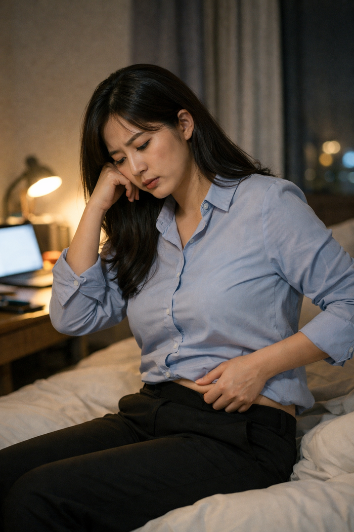 야근 후 늘어난 뱃살에 고민하는 여성의 모습. 사진=챗GPT 야근에 회식,주말에도 밀린 업무가 이어진다. 먹는 양은 그대로인데 허리띠 구멍은 하나씩 뒤로 밀린다. “나이 탓인가” 싶지만 최근 연구들은 억울해도 사실이라고 말한다. 스트레스는 실제로 체중이 늘기 쉬운 방향으로 몸을 바꾼다는 것이다.