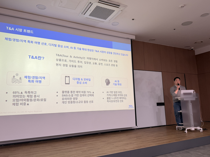 놀유니버스는 18일 서울 강남구 야놀자 본사에서 열린 ‘놀 프리뷰: 해외 T&A 사업 소개’ 설명회를 통해 해외 T&A 사업 현황과 2026년 계획을 공개했다. 자유여행 확대 흐름에 맞춰 투어·액티비티 사업을 확대하겠다는 구상이다.
