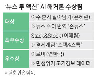 최우수상은 '스택&스톡(Stack&Stock)' 팀이 안았다. 이 팀이 만든 서비스는 뉴스 데이터를 기반으로 한 하루 단위 경제 시뮬레이션 게임이다. 플레이어는 대학생 캐릭터를 조종해 매일경제 뉴스 기사를 읽고 경제 상황을 주체적으로 해석해 자산을 운용한다. 80일간 종잣돈 100만원을 불려 등록금 500만원을 모으는 게 목표다. 이혜림 팀장은 "뉴스 데이터를 바탕으로 직접 판단하고 결정해보는 경험이 있으면 경제를 알아가는 데 도움이 될 것"이라고 말했다.